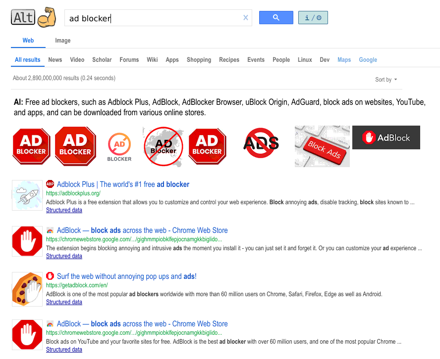 Alt-Power Search Your Google results got quite worse recently? Trying to escape Big Tech and get back your time? Value your privacy? Do you value your time? Are you longing for Google the way it was years ago? Alt(ernative), Power Search is a general-purpose internet search engine, committed to bringing you the best search experience. Alternative and akin to Google, which it has its roots in, just somewhat better—the interface is slightly clunkier and more verbose, like a very well stocked, vast but easily searchable, ancient but up-to-date library of structured internet content. We hope you like it as much as we do, but your mileage may vary! Settings JavaScript is required but disabled. Country / locale: Loading… Open results links in new tabs Show AI-generated summary Dark theme 🌗 Safe Search 🧒 Reload the page for the changes to take effect. Advanced Search Operator Syntax Alt-Power Search follows industry-standard advanced search operator syntax similar to Google's, namely summarized in the following table: Table 1: Advanced power-search operators supported on Alt-Power Search (most of these are also supported on Google). Placeholder {query} stands for the user's full search query, and other placeholders are fittingly named. Use these powerful query modifiers and techniques to improve the quality and relevance of your search results. Most used advanced search operators Search query format Examples Explanation "{query}" "to be or not to be" Exact (verbatim) match, matching word order and character spacing and all. -{query} jaguar -car Minus sign (-) just before any negative words, irrelevant for the query. {query1} OR {query2} (WordPress OR Joomla) guide Use OR to find any of several options. Surround with parentheses if using other keywords. ext:{file extension} ext:pdf boletus Search only among file types / files with extension. site:{domain} site:gov memes site:cz.wikipedia.org Limit search results to a specific website or domain. Additional / convenience operators {from}..{to} 10..35 kg $10..$120 2010..2011 To define the search range, put two full stops (..) between the low and high numbers, trailing with an optional unit of measurement. This can be used e.g. for product prices and publication dates. after:{date} after:2001-09-11 Show results discovered after the specified date (in ISO 8601 date format: YYYY-MM-DD). before:{date} before:2020-03-12 Show results discovered before the specified date (in ISO 8601 date format). intitle:{keyword} allintitle:{query} allintitle:Index of Show only results where the keyword (or the whole query) is contained in HTML <title> text. intext:{keyword} allintext:{query} ext:java intext:executeUpdate Show only results where the keyword (or the whole query) appears in the page main article text. inurl:{keyword} allinurl:{query} inurl:"cgi-bin/koha" Show only results where the keyword (or the whole query) appears in the page URL. imagesize:{width}x{height} pussy imagesize:1920x1080 Filter images by exact size when in Images tab. location:{location} sweet home location:Alabama Show results tailored to a country or location. {source loc.} to {dest loc.} New York to Rome After running the query, simply click on the Maps refinement/tab to get instant navigation directions between source and destination locations. See also: map:. weather:{location} weather:Cairo Pages reporting weather at location. stocks:{ticker} stocks:GOOG Results related to a specific stock/futures/forex/crypto market ticker. map:{location} map:Stockholm to Paris Results related to a specific address or location, including navigation directions. schema:{schema type} schema:JobPosting RDF/Structured search based on Schema.org types that are expected to be present on the result web page. Click on Structured data link next to each result to see types and entities present on that particular web page. When applicable, you can additionally sort results pages by date, title ‼️, price, rating ⭐️, citations, generalized structured data, etc. Reasons to Use Alt-Power & The Importance of Search Even at the dawn of the age of AI, a reliable search tool is as important as ever. Alt-Power is free, fast, exact, correct, intuitive, privacy-conscious, and empowering for You the User, maintaining its motives pure and free of conflicts of interest. In your personal effort to degoogle, try Alt-Power. Join the resistance. Take back control! ✊ Is Google Getting Worse? — Freakonomics What happened to Google search? It has become nearly impossible to find relevant results. — Reddit Enshittification (of Google Search) — Wikipedia We're gonna make more money if we make the search engine worse, and nothing bad will happen to us. — Cory Doctorow for Novara Media [...] the happier users are, the less Google earns. — Search Engine Land With all the generative AI slop, it's increasingly important to prefer search engines that still behave like tools, not omniscient oracles. Alt-Power features: visible result counts to judge query quality, full target URLs to assess sources at a glance, first-class structured/Schema search to extract machine-readable facts, powerful results ordering controls (e.g. strict sort-by-date, title etc.), practical search facets covering most popular real-world research tasks, and more. Try Alt-Power today! Set as Default Search Engine Alt-Power Search can be configured to return search results proactively (at initiation), by setting the search query parameter ?q= when constructing the URL. You can add this powerful search engine to your web browser now: Mozilla Firefox: simply right-click on the location bar and select Add Alt-Power Search; Google Chrome (instructions also cover Microsoft Edge, Chromium, Brave, Opera & Vivaldi)—if the option for this search engine doesn't show up, try first to ☰ > Delete Browsing Data in the app menu. On Firefox Mobile and any other supporting browser, including for programmatic access, you can set the search query paramet